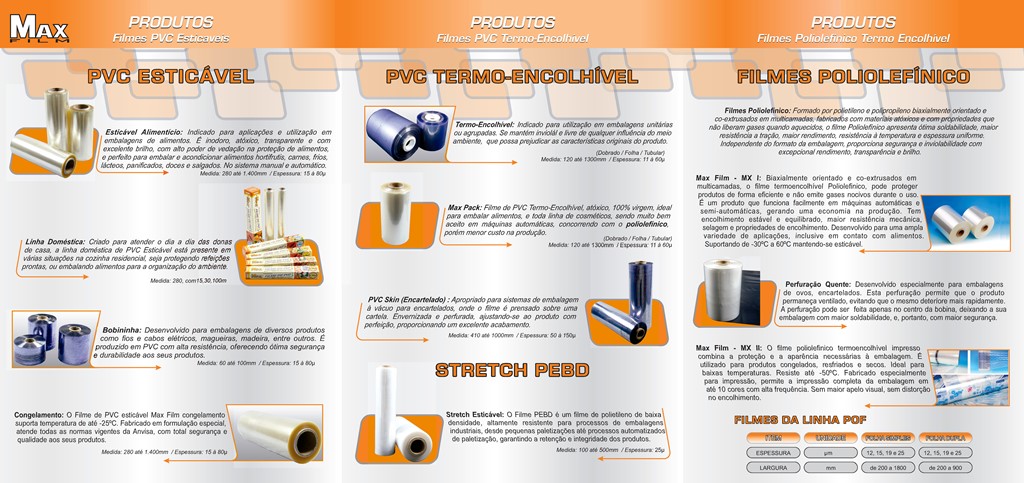 A Max Film Indústria de Plásticos, é uma empresa Nacional atuando no mercado de embalagens a 30 Anos, especializada na Fabricação de Filmes em PVC Flexíveis para vários segmentos : Através de nossa alta tecnologia e controle de qualidade em nossos equipamentos e produtos, atendemos todos os segmentos da linha industrial, comércio e serviços, linhas promocionais, alimentícia, supermercados, distribuidores, automobilística, fios e cabos, farmacêutica, gráfica, têxtil, brinquedos, cosmética, utilidades doméstica, entre outros.